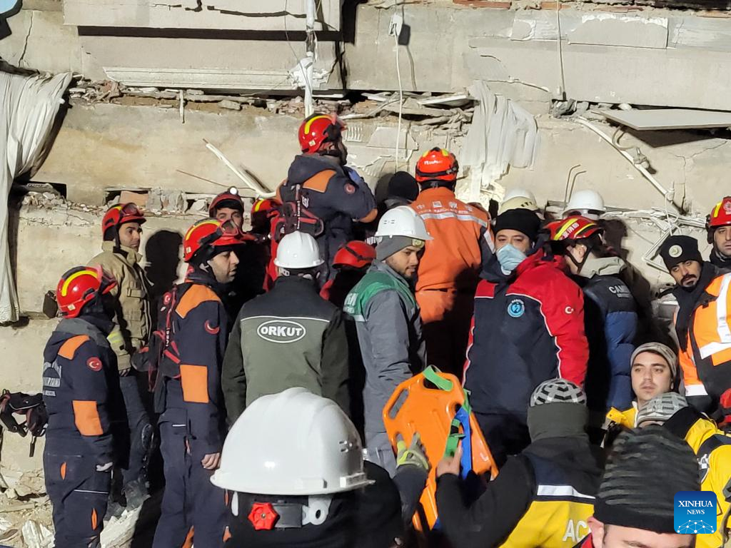 هاتاي، تركيا 9 فبراير 2023 (شينخوا) بعد جهود مشتركة استمرت لساعات قامت بها فرق الإنقاذ الصينية والتركية، تم إنقاذ امرأة حامل من بين أنقاض مبنى منهار اليوم (الخميس)، بعد ثلاثة أيام من كارثة الزلزال المدمر الذي بلغت قوته 7.7 درجة والذي ضرب جنوبي تركيا وشمالي سوريا.