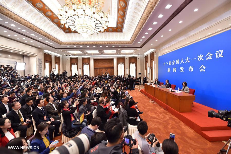 بكين 4 مارس 2018 (شينخوا) في الصورة الملتقطة يوم 4 مارس 2018، جانب من المؤتمر الصحفي المنعقد هنا اليوم في قاعة الشعب الكبرى للدورة الأولى للمجلس الوطني الـ13 لنواب الشعب الصيني، حيث أجاب تشانغ يه سوي المتحدث باسم الدورة على أسئلة الصحفيين المحليين والأجانب حول أجندة الدورة وأعمال المجلس.
