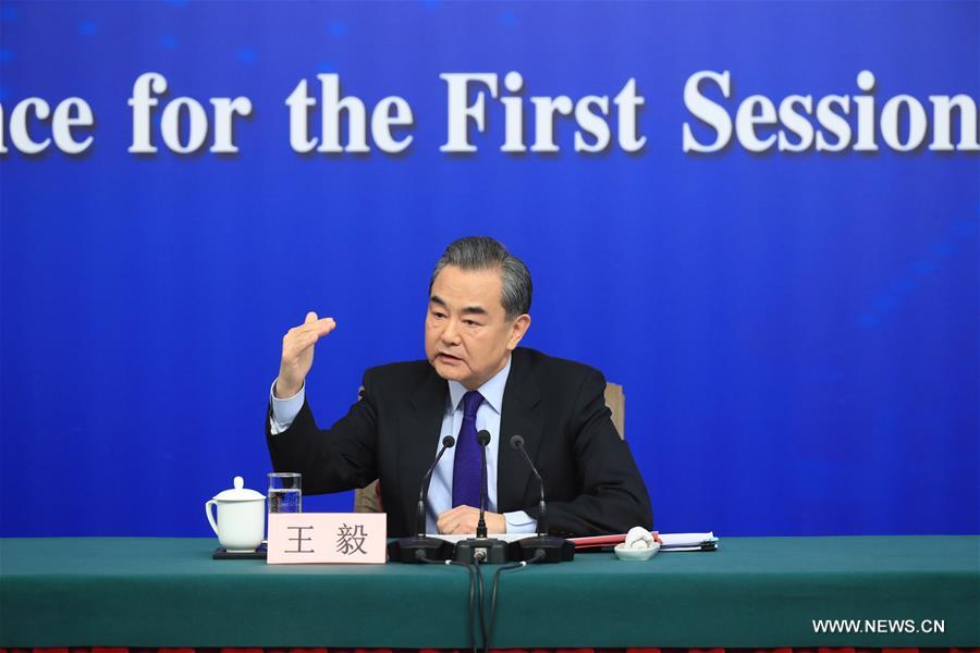 بكين 8 مارس 2018 (شينخوا) في الصورة الملتقطة يوم 8 مارس 2018، وزير الخارجية الصيني وانغ يي يجيب أسئلة الصحفيين الصينيين والأجانب في المؤتمر الصحفي الذي عقد على هامش الدورة السنوية للمجلس الوطني لنواب الشعب الصيني في بكين.