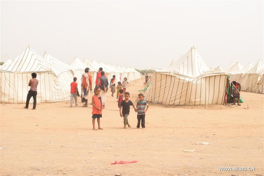 عدن 13 يوليو 2018 (شينخوا) في الصورة الملتقطة يوم 12 يوليو 2018، مشهد لأطفال يمنيين مشردين في مدينة عدن الميناء. يواجه آلاف المشردين داخليا، الذين نجوا من المواجهات المسلحة الحالية بين القوات الحكومية ومقاتلي الحوثي في مدينة الحُديدة على ساحل البحر الأحمر، العديد من التحديات في عدن.