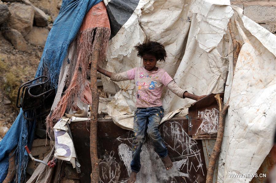 23 يوليو 2018(شينخوا) في الصورة الملتقطة يوم 22 يوليو 2018، مشهد لطفلة مشردة تقف أمام خيمة بمنطقة عشوائية في صنعاء باليمن.الكثير من الأسر المشردة القادمة من ميناء الحُديدة لا تجد فرصة لدخول مخيمات المشردين في صنعاء، وبدلا من ذلك يقيمون في المناطق العشوائية في صنعاء. أكثر من 35000 أسرة شُردت مؤخرا من ميناء الحديدة على البحر الأحمر بسبب القتال العنيف بين القوات الحكومية ومتمردي جماعة الحوثي، وفقا لما أعلنه مكتب تنسيق الشؤون الإنسانية في 16 يوليو.