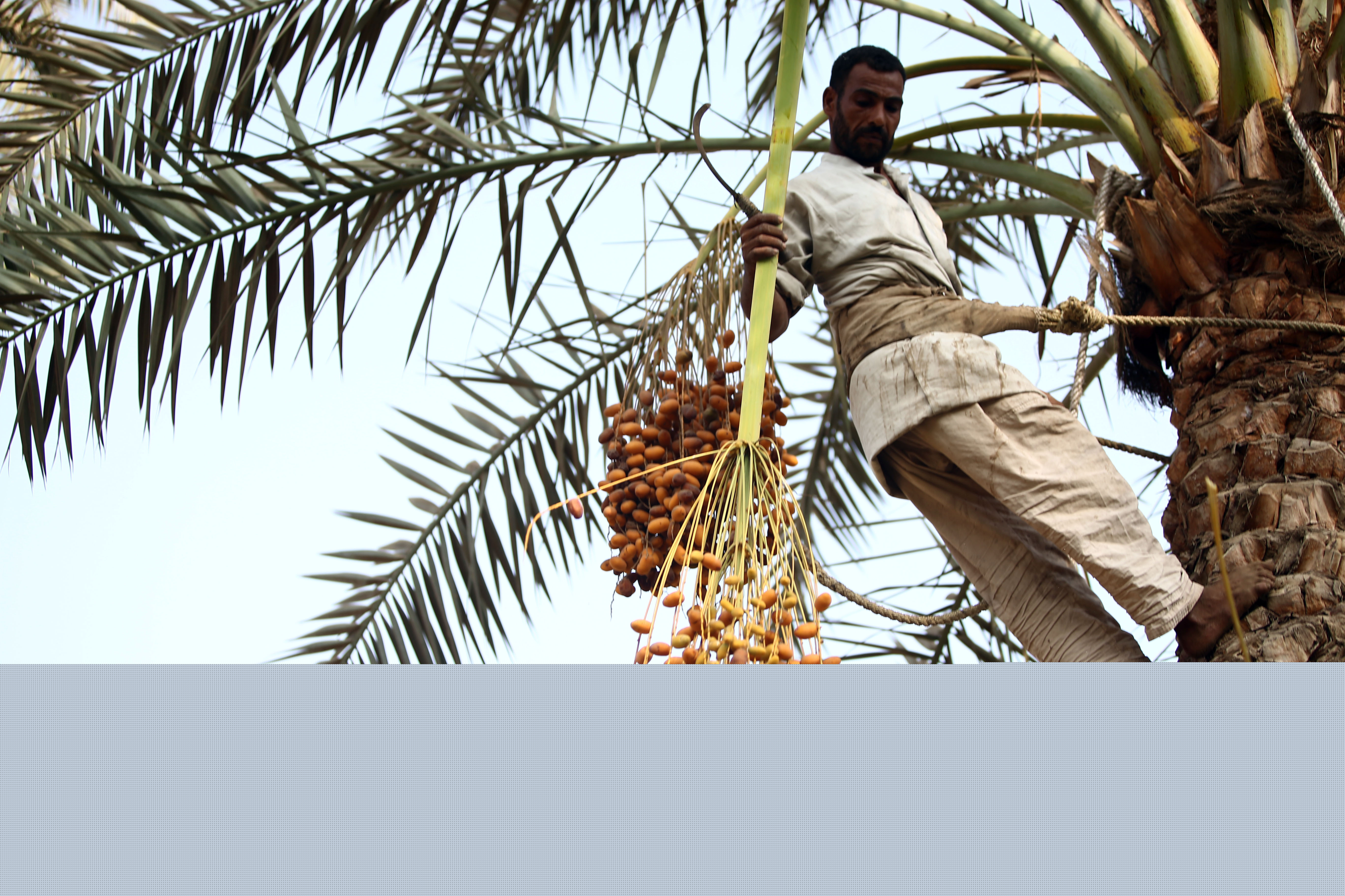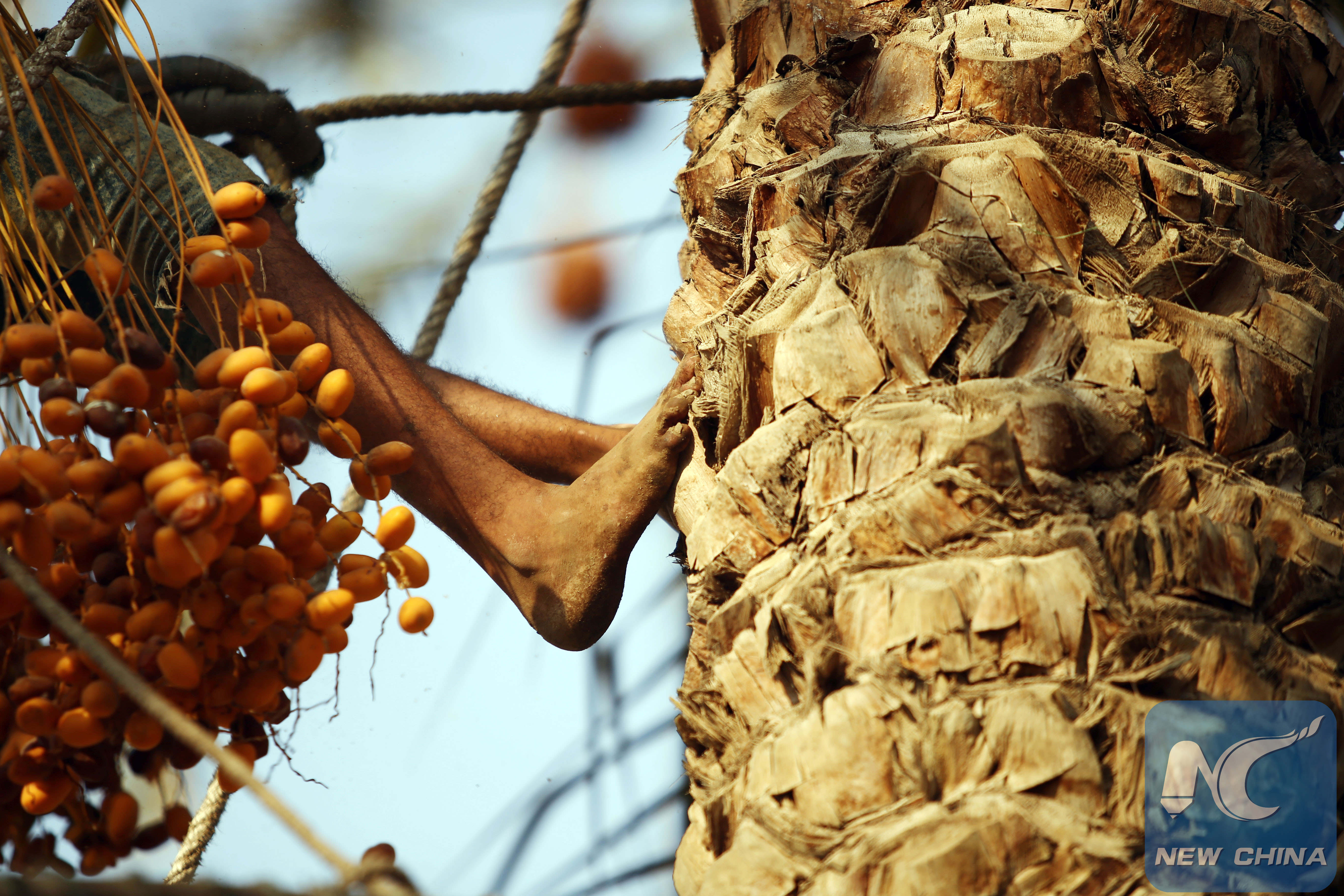 الصور الملتقطة في 2 أغسطس 2018 تظهر مصريين يجمعون التمر في قرية المرازيق في الجيزة في مصر. يحل موسم حصاد التمر دائما في بداية سبتمبر في مصر.