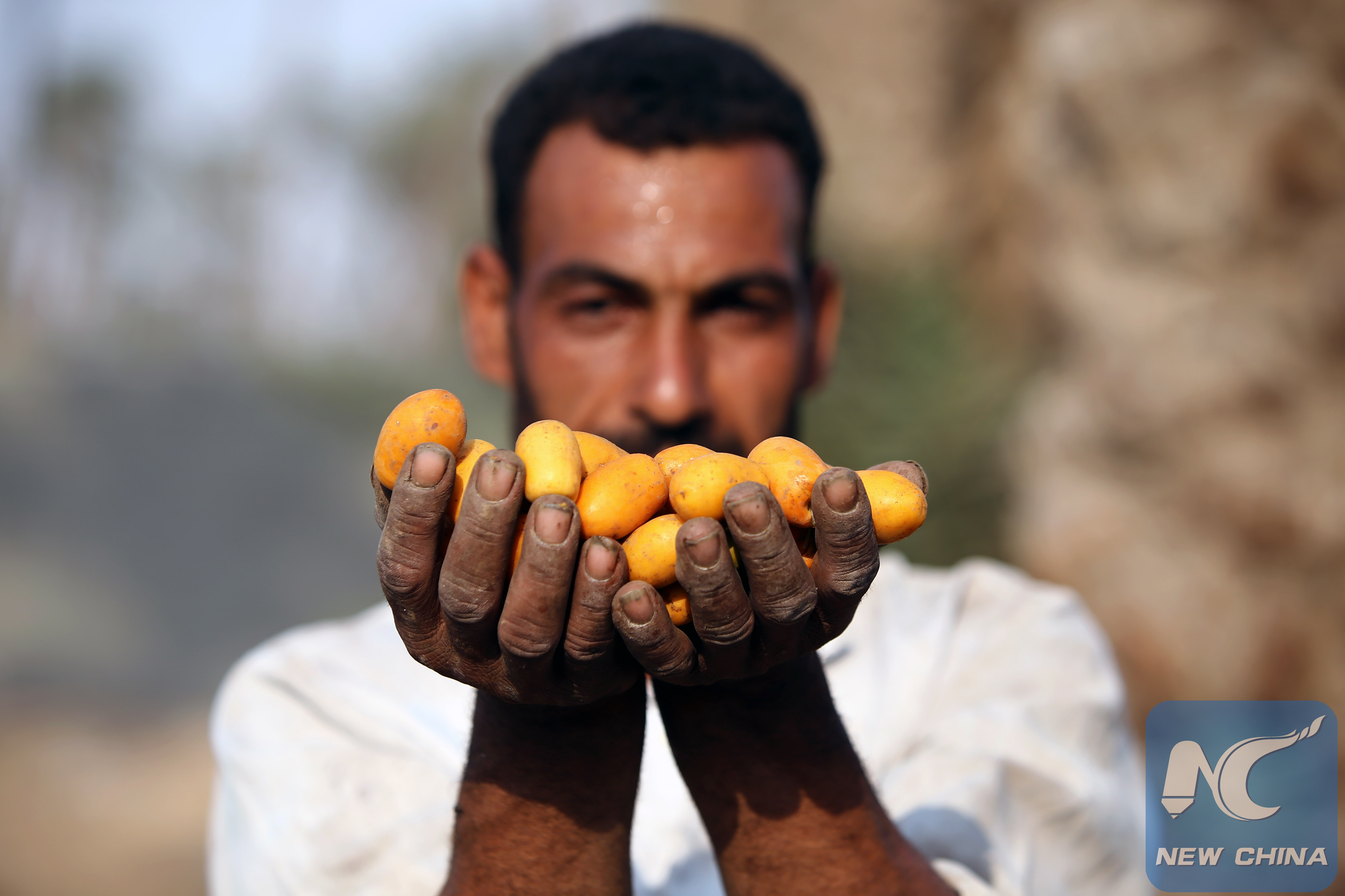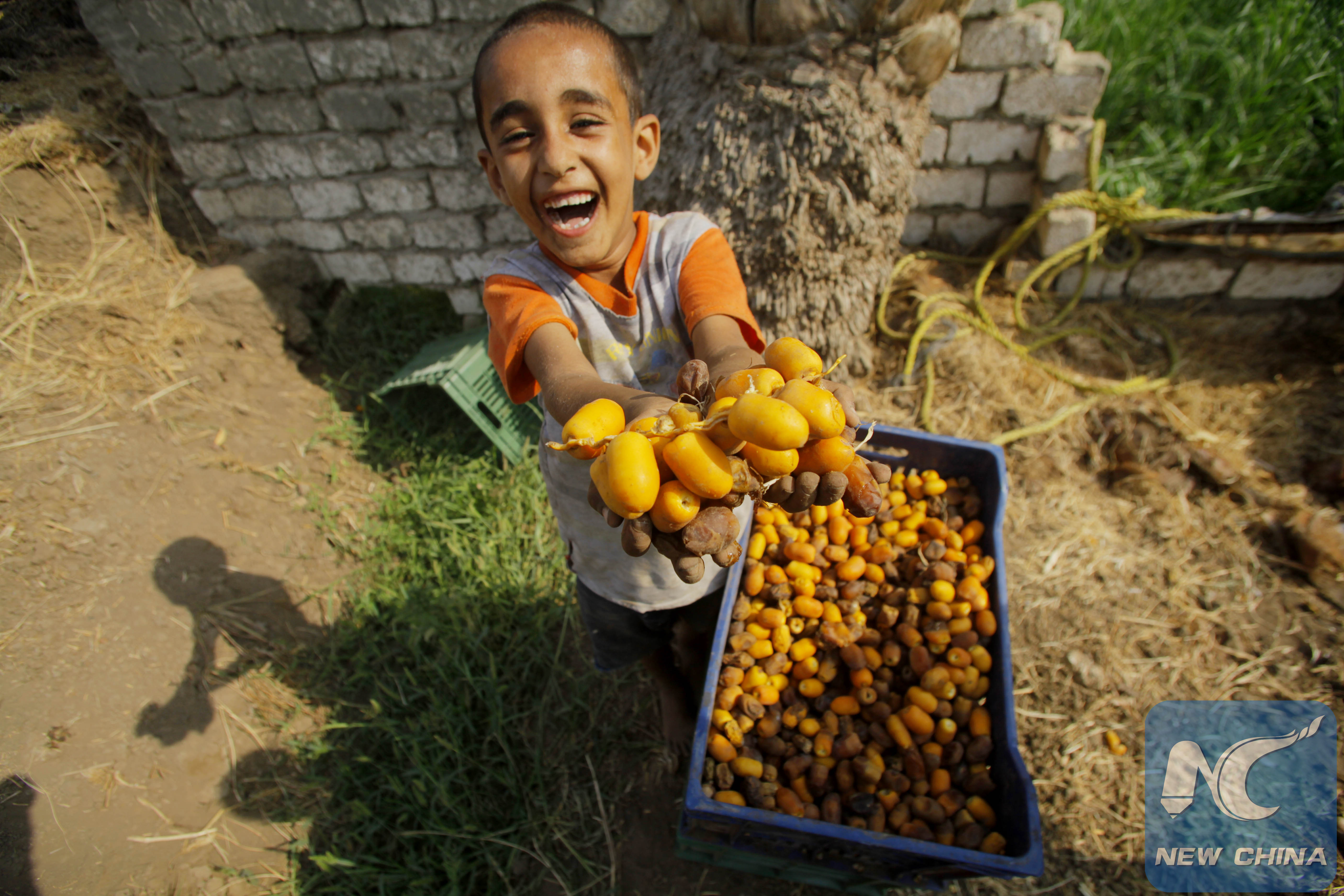 الصور الملتقطة في 2 أغسطس 2018 تظهر مصريين يجمعون تمر جمعت حديثا في قرية المرازيق في الجيزة في مصر. يحل موسم الحصاد للتمر دائما في بداية سبتمبر في مصر.