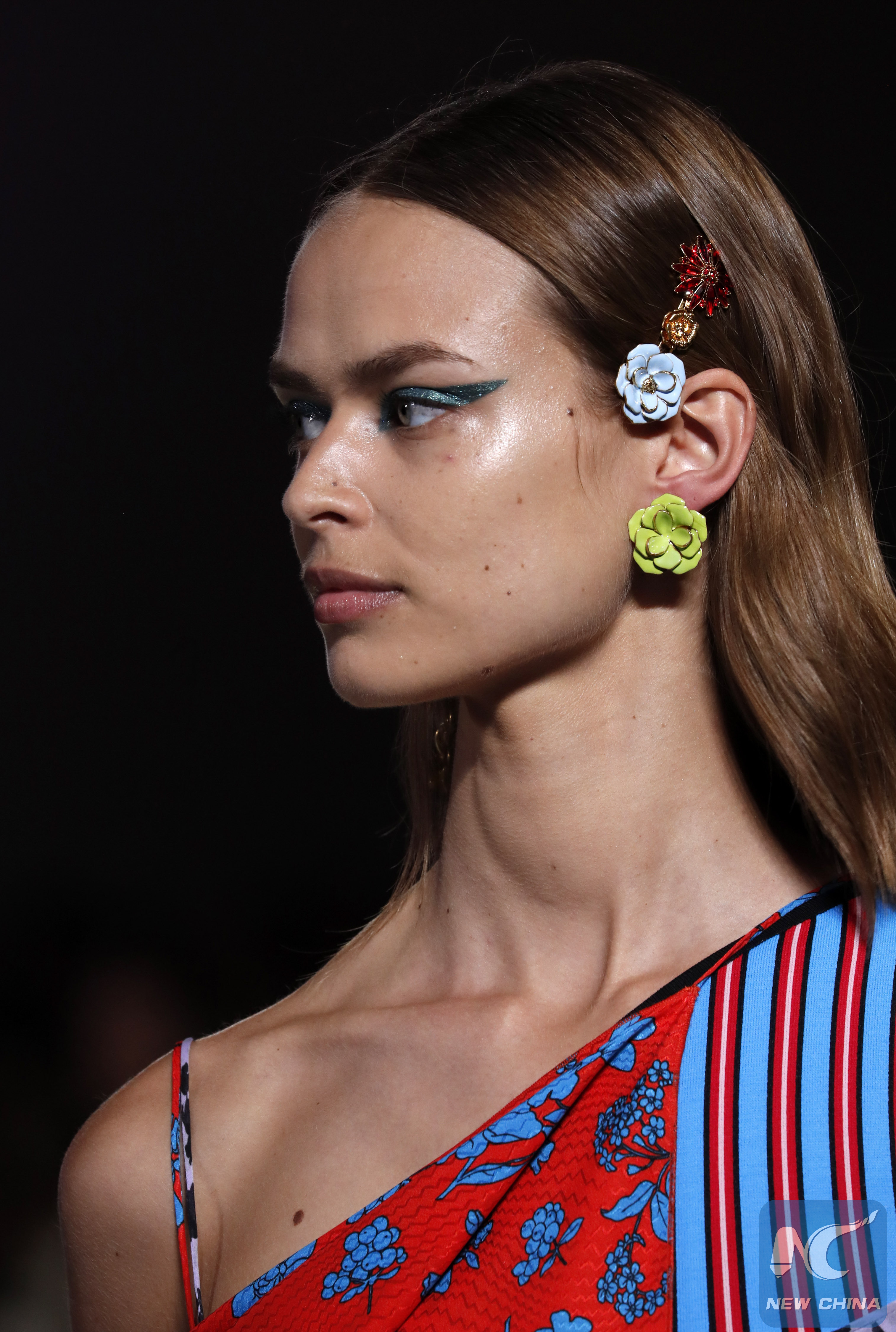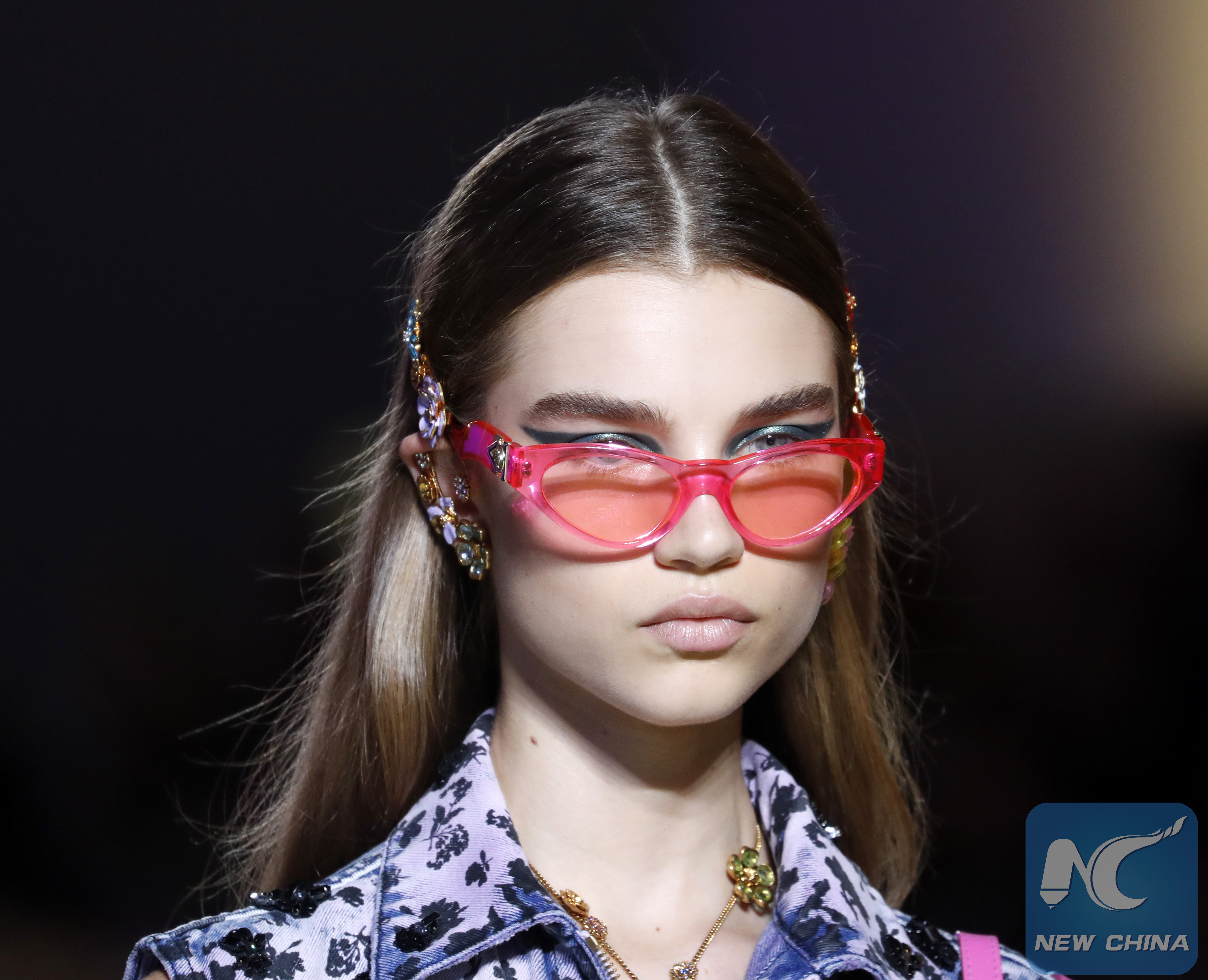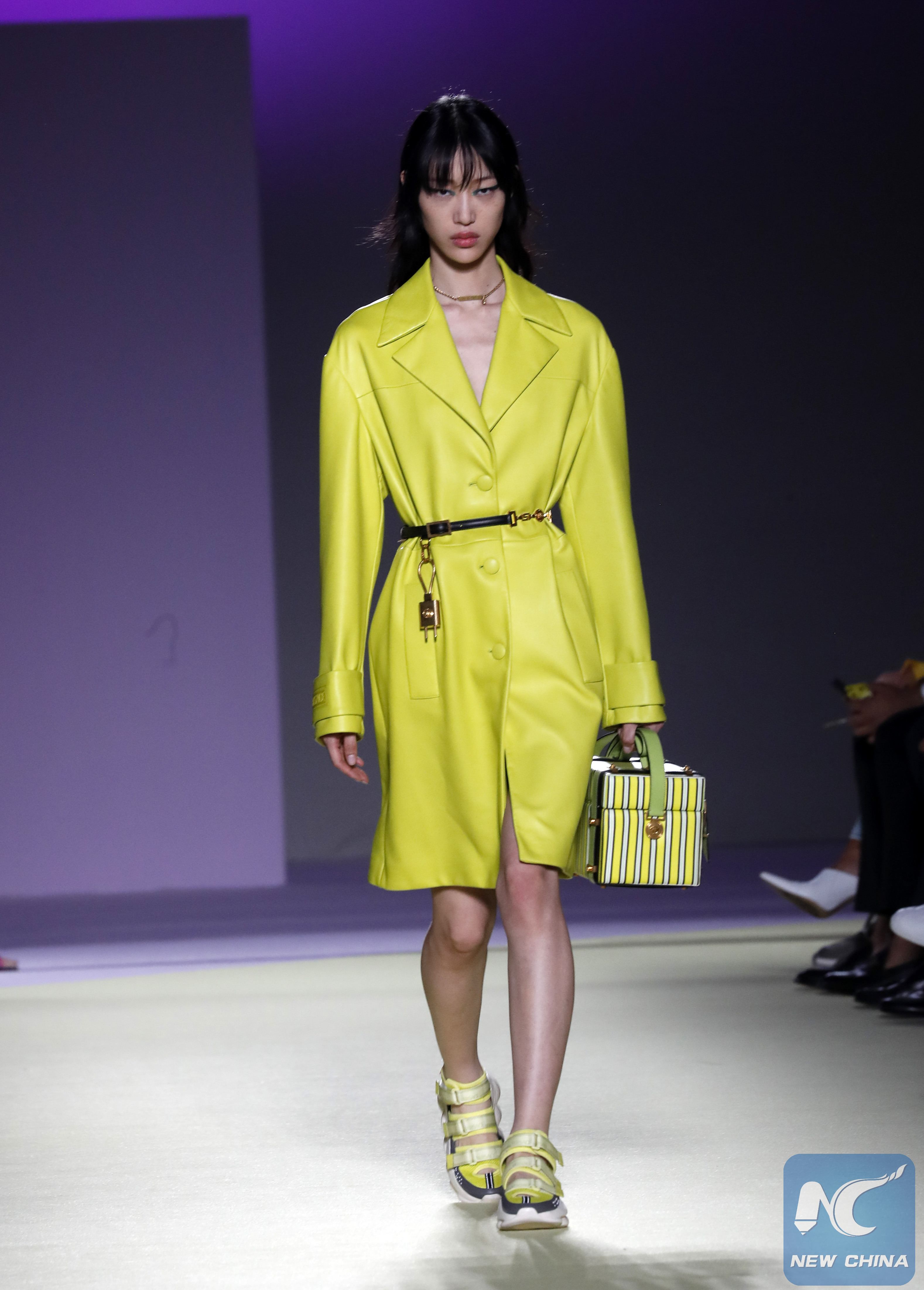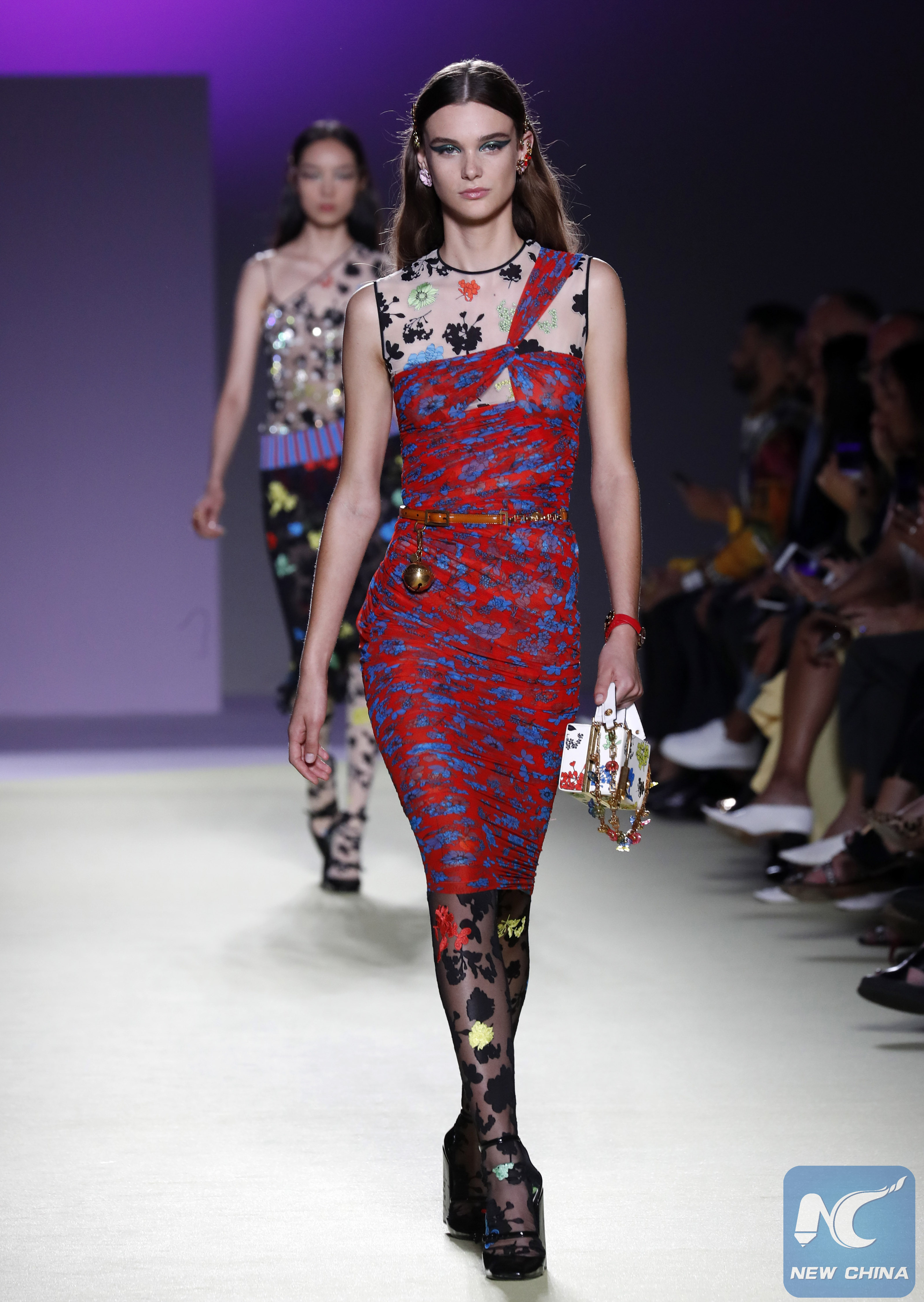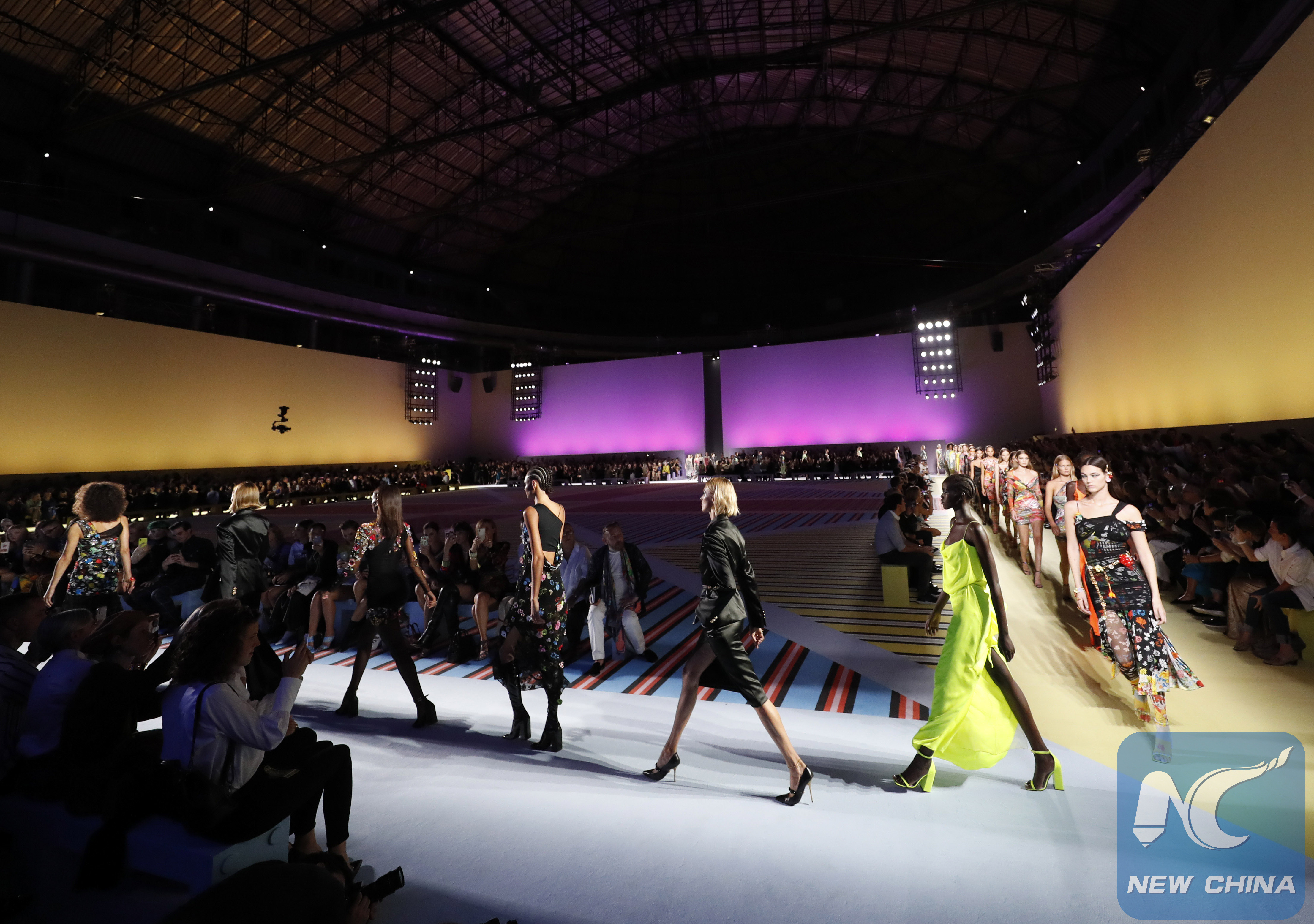 الصور الملتقطة في 21 سبتمبر تظهر عارضات أزياء وهن يسرن على خشبة مسرح عرض نظمته شركة فيرساتشي خلال أسبوع الموضة في ميلانو لربيع وصيف 2019 في مدينة ميلانو الإيطالية.