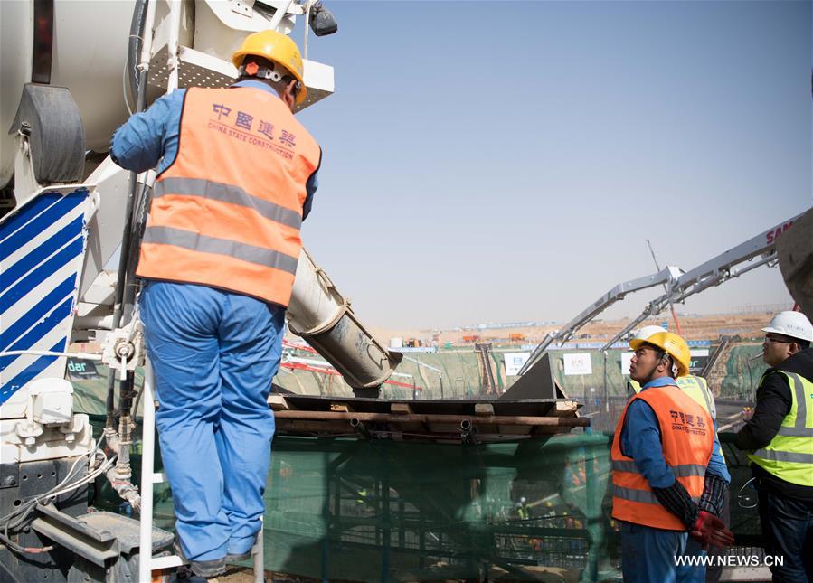 في الصورة الملتقطة يوم 25 فبراير 2019، أشخاص يعملون بموقع بناء بالعاصمة الإدارية الجديدة قيد الإنشاء، على مسافة نحو 45 كليو متر من القاهرة، مصر. أشاد رئيس الوزراء المصري مصطفى مدبولي، اليوم(الإثنين)، بالتقدم الذي أحرزته شركة الإنشاءات الهندسية الوطنية الصينية في بناء (البرج المَعلَم) الواقع في حي الأعمال المركزي بالعاصمة الإدارية الجديدة.