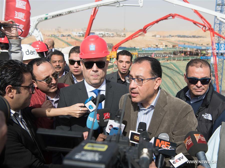 في الصورة الملتقطة يوم 25 فبراير 2019، رئيس الوزراء المصري مصطفى مدبولي يتحدث خلال مقابلة بموقع بناء بالعاصمة الإدارية الجديدة قيد الإنشاء، على مسافة نحو 45 كليو متر من القاهرة، مصر. أشاد رئيس الوزراء المصري مصطفى مدبولي، اليوم(الإثنين)، بالتقدم الذي أحرزته شركة هندسة الإنشاءات الوطنية الصينية في بناء (البرج المَعلَم) الواقع في حي الأعمال المركزي بالعاصمة الإدارية الجديدة.