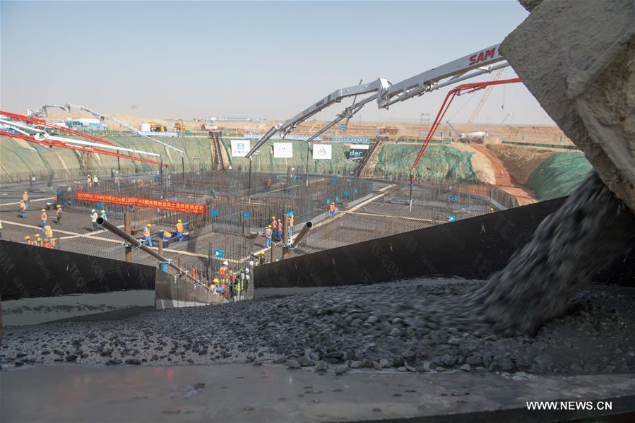 في الصورة الملتقطة يوم 25 فبراير 2019، أشخاص يعملون بموقع بناء بالعاصمة الإدارية الجديدة قيد الإنشاء، على مسافة نحو 45 كليو متر من القاهرة، مصر. أشاد رئيس الوزراء المصري مصطفى مدبولي، اليوم(الإثنين)، بالتقدم الذي أحرزته شركة هندسة الإنشاءات الوطنية الصينية في بناء (البرج المَعلَم) الواقع في حي الأعمال المركزي بالعاصمة الإدارية الجديدة.