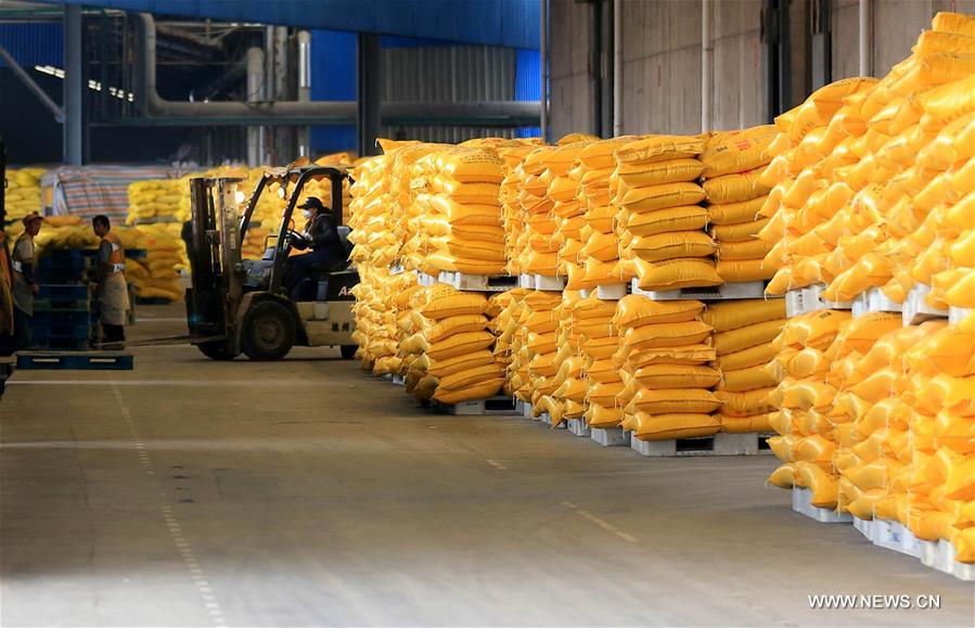 فوتشوان، قويتشو 27 فبراير 2019 (شينخوا) في الصورة الملتقطة 26 فبراير 2019 ،عمال ينقلون أكياسا معبئة بالاسمدة الكيماوية في محطة فوتشوان للقطار بمقاطعة قويتشو في جنوب غربي الصين، وذلك لضمان أعمال الزراعة بمناسبة موسم الربيع المقبل.