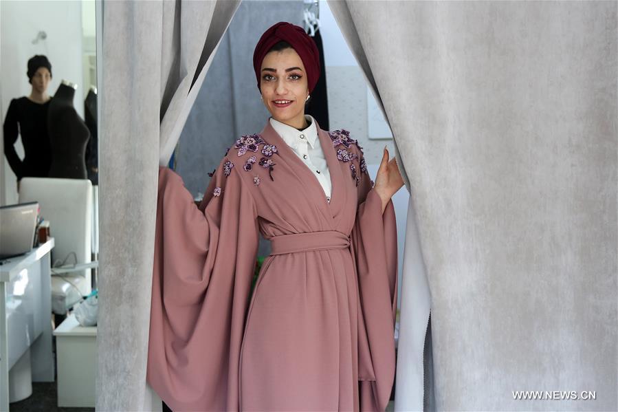غزة 21 مارس 2019 (شينخوا) في الصورة المُلتقطة يوم 20 مارس 2019، مصممة الأزياء الفلسطينية نرمين الحوراني ترتدي أحد إبداعاتها في مشغلها الذي يحمل اسم " تصميمات نيمو" في مدينة غزة. وأبدت نرمين الحوارني، 22 عاما، اهتماما بالموضة منذ طفولتها. وتقوم نرمين بتصيمم الملابس لنفسها ولأسرتها، كما تنشر صورا للأزياء التي صممتها على المواقع الألكترونية.