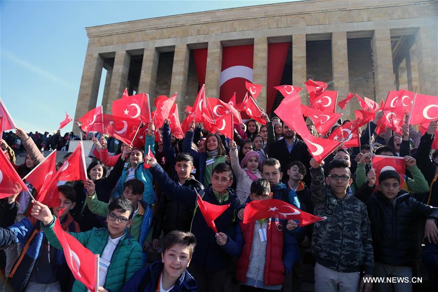 أنقرة 24 أبريل 2019(شينخوا) في الصورة الملتقطة يوم 23 أبريل 2019، أطفال أتراك يلوحون بالأعلام الوطنية أمام ضريح أتاتورك، في إطار الاحتفال بعيد الطفولة والسيادة الوطنية في أنقرة، تركيا.