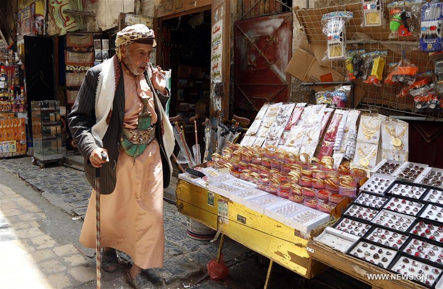 صنعاء 2 مايو 2019(شينخوا) في الصورة الملتقطة يوم 2 مايو 2019، رجل يمني يحمل سلعا اشتراها من سوق في صنعاء باليمن، استعدادا لشهر رمضان.
