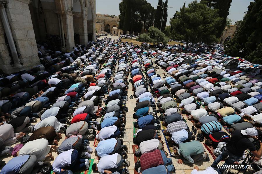 القدس 18 مايو 2019 (شينخوا) في الصورة الملتقطة يوم 17 مايو 2019، مسلمون يصلون في المسجد الأقصى في القدس خلال شهر رمضان الكريم.