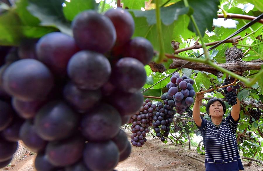 شيجياتشوانغ 26 مايو 2019 (شينخوا) في الصورة الملتقطة يوم 23 مايو 2019، مزارعة تدير بستنة العنب في قرية لي جيا يو بمدينة تشيانآن في مقاطعة خبي بشمالي الصين. وعززت مدينة تشيانآن في مقاطعة خبي تطوير الزراعة لتوسيع نظامها حيث انتشرت زراعة أشجار التفاح والخوخ والكرز وغيرها لدفع نهضة في الأرياف. وبلغت مساحة زراعة أشجار الفواكه 190 ألف مو (مو واحد يساوي نحو 666 مترا مربعا) مما يزيد دخول المزارعين.