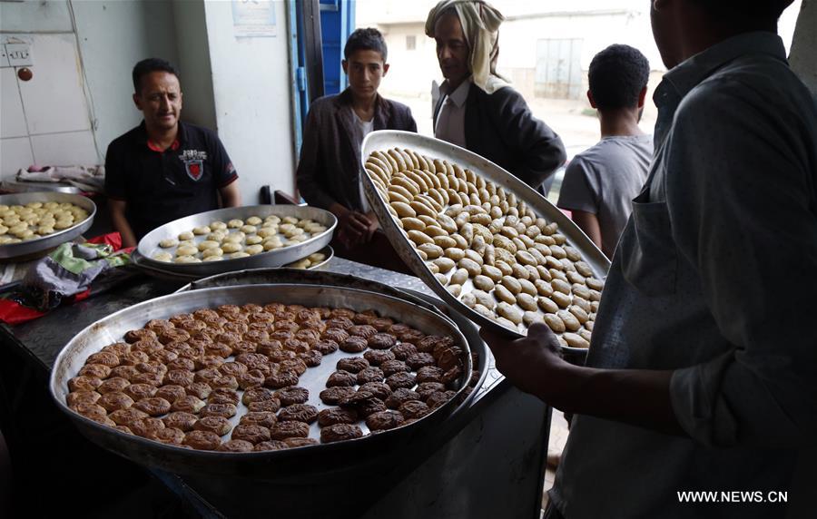 صنعاء 3 يونيو 2019 (شينخوا) في الصورة الملتقطة يوم 2 يونيو 2019، مواطنون ينتظرون خبز كعكهم وذلك قبل أيام من حلول عيد الفطر المبارك في العاصمة اليمنية صنعاء، حيث يمارس اليمنيون شتى أنواع العادات قبيل حلول عيد الفطر.