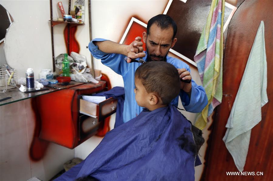 صنعاء 3 يونيو 2019 (شينخوا) في الصورة الملتقطة يوم 2 يونيو 2019، حلاق يصفف شعر صبي في حانوته في العاصمة اليمنية صنعاء، حيث يمارس اليمنيون شتى أنواع العادات قبيل حلول عيد الفطر.