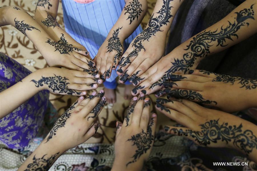 صنعاء 3 يونيو 2019 (شينخوا) في الصورة الملتقطة يوم 2 يونيو 2019، فتيات يبدين أيديهم المزخرفة بالحناء وذلك قبل أيام من حلول عيد الفطر المبارك في العاصمة اليمنية صنعاء، حيث يمارس اليمنيون شتى أنواع العادات قبيل حلول عيد الفطر.