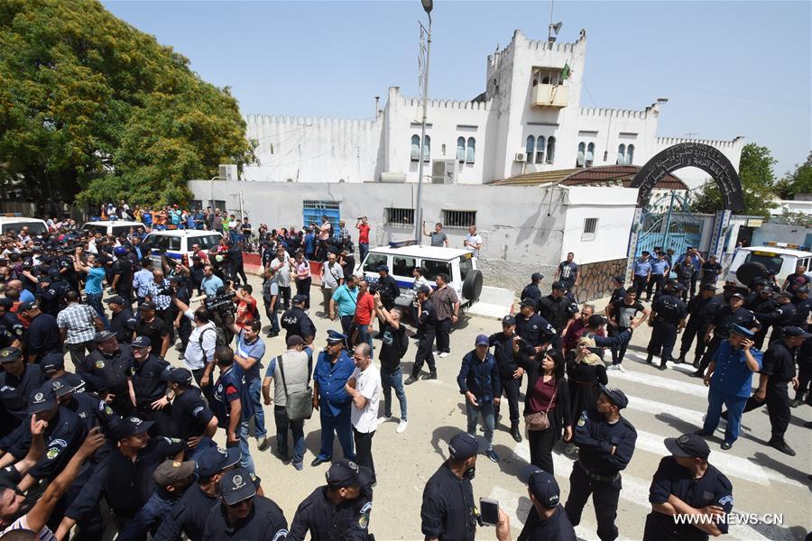 الجزائر 14 يونيو 2019 (شينخوا) في الصورة الملتقطة يوم 13 يونيو 2019، جزائريون ينتظرون وصول رئيس الوزراء الجزائري الأسبق عبد المالك سلال لمقر سجن الحراش بالجزائر العاصمة. أمر قاضي التحقيق بالمحكمة العليا الجزائرية يوم الخميس بإيداع رئيس الوزراء الجزائري الأسبق عبد المالك سلال الحبس المؤقت بتهم فساد، بحسب تليفزيون النهار الجزائري الخاص.