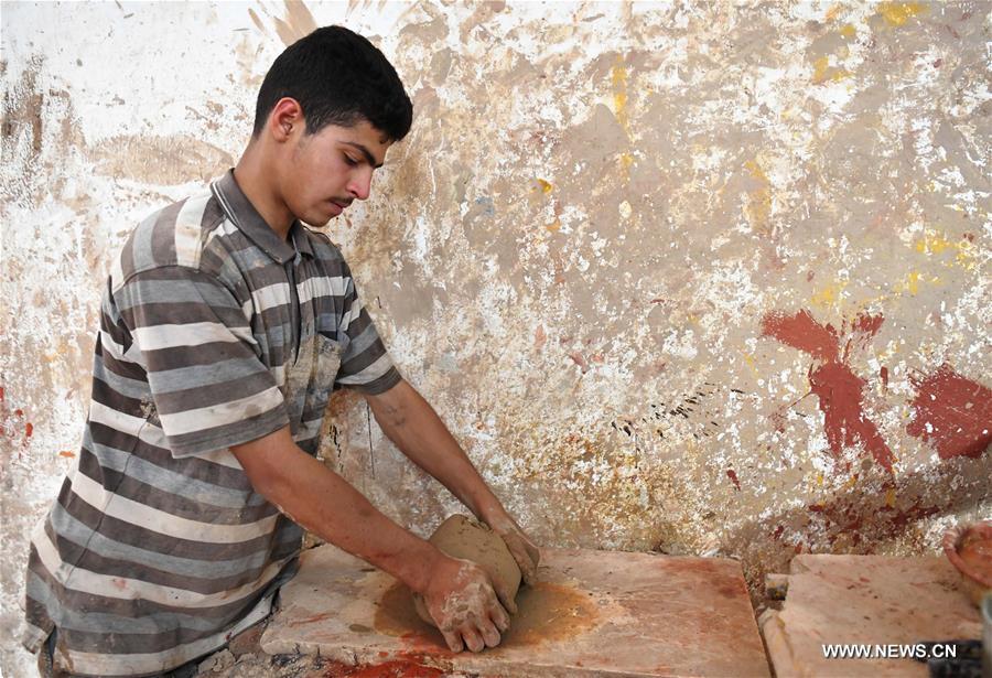 حمص 24 يونيو 2019 (شينخوا) في الصورة الملتقطة يوم 22 يونيو 2019، نجل الحرفي السوري زكريا قرقوش يصنع أواني فخارية في ورشة والده بمدينة حمص وسط سوريا، حيث تمكن قرقوش (43 عاما)، من الفرار مع عائلته إبان اندلاع الحرب في حلب قبل سنوات، وتمكن من الوصول مع حرفته التي ورثها عن أجداده، إلى محافظة حمص (وسط سوريا) ليستقر بها سنوات طويلة وتصبح موطنه الثاني.