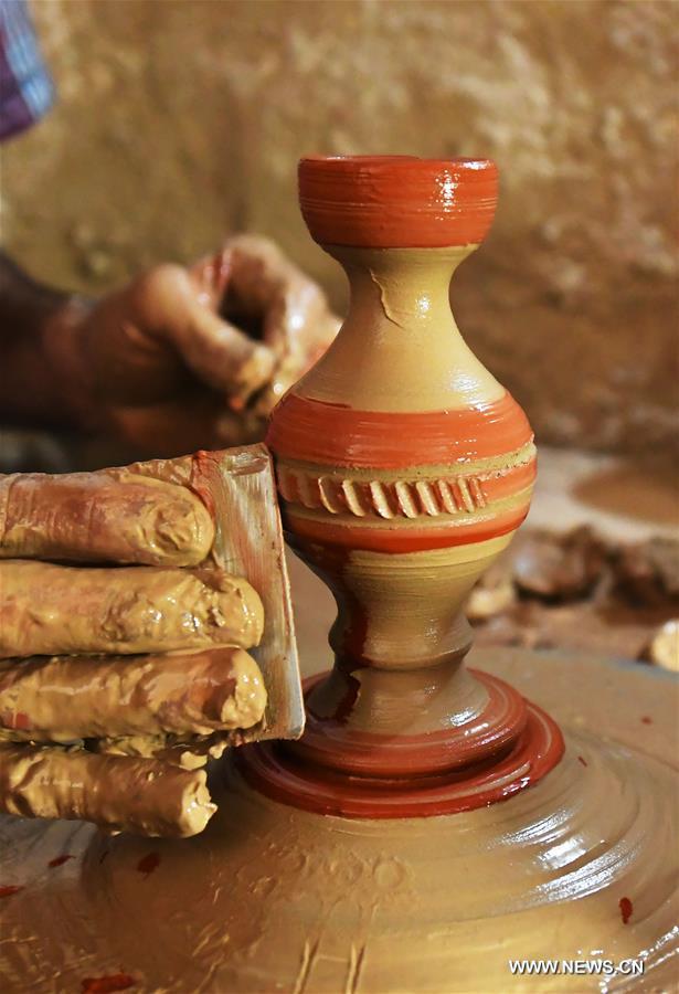حمص 24 يونيو 2019 (شينخوا) في الصورة الملتقطة يوم 22 يونيو 2019، حرفي سوري يدعى زكريا قرقوش يصنع أواني فخارية في ورشته بمدينة حمص وسط سوريا، حيث تمكن قرقوش (43 عاما)، من الفرار مع عائلته إبان اندلاع الحرب في حلب قبل سنوات، وتمكن من الوصول مع حرفته التي ورثها عن أجداده، إلى محافظة حمص (وسط سوريا) ليستقر بها سنوات طويلة وتصبح موطنه الثاني.