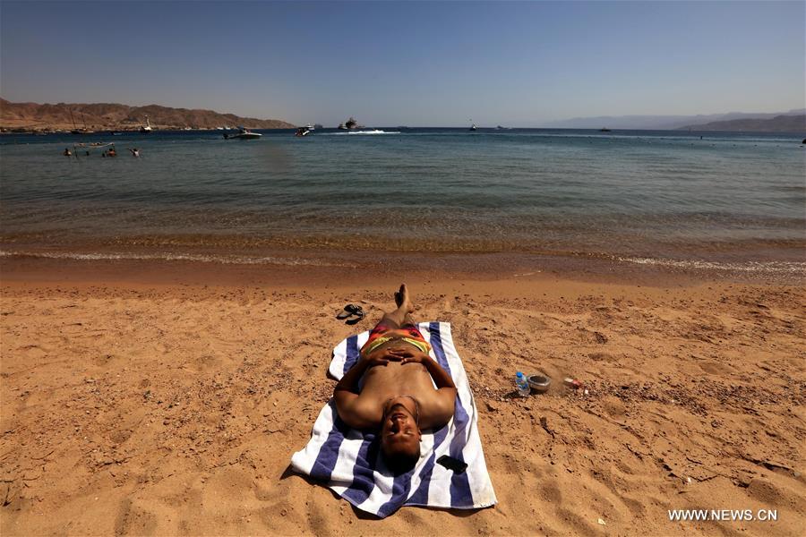 العقبة (الأردن) 29 يونيو 2019(شينخوا) في الصورة الملتقطة يوم 28 يونيو 2019، سائح يستمتع بوقته على شاطيء ميناء العقبة، جنوبي الأردن على البحر الأحمر. وتجتذب العقبة، بشواطئها الشهيرة ورياضاتها المائية المتعددة، سائحين من الأردن ومن خارجها يأتون للتمتع بعطلاتهم الصيفية .