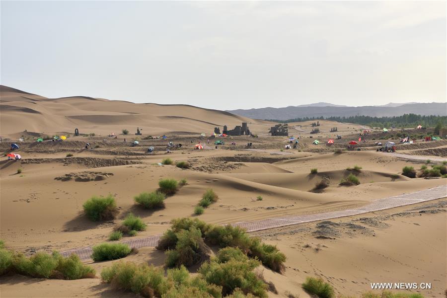 توربان 3 يوليو 2019 (شينخوا) في الصورة الملتقطة يوم 2 يوليو، سياح يجربون العلاج بالرمال في صحراء كوم تاغ في محافظة شانشان، بمنطقة شينجيانغ الويغورية الذاتية الحكم شمال غربي الصين. ويأتي السياح إلى الصحراء في الصيف لتجربة العلاج بالرمال، وهو مزيج من حمام الشمس، والعلاج الحراري والتدليكي.