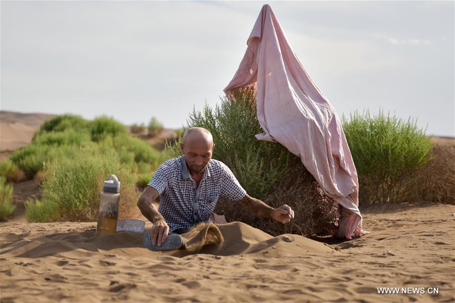 توربان 3 يوليو 2019 (شينخوا) في الصورة الملتقطة يوم 2 يوليو، سائح يجرب العلاج بالرمال في صحراء كوم تاغ في محافظة شانشان، بمنطقة شينجيانغ الويغورية الذاتية الحكم شمال غربي الصين. ويأتي السياح إلى الصحراء في الصيف لتجربة العلاج بالرمال، وهو مزيج من حمام الشمس، والعلاج الحراري والتدليكي.
