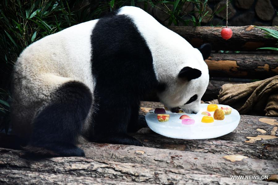 جينان 16 يوليو 2019 (شينخوا) في الصورة الملتقطة 15 يوليو 2019، حيوان الباندا العملاق يأكل الفواكه المجمدة في حديقة الحيوانات البرية بمدينة جينان حاضرة مقاطعة شاندونغ في شرقي الصين، حيث قدمت الحديقة غرفة مجهزة بمكيف الهواء درجة الحرارة فيها 16 درجة مئوية علاوة على فواكه مجمدة وخيزران طازج، لكي يصطاف في الصيف الحار.