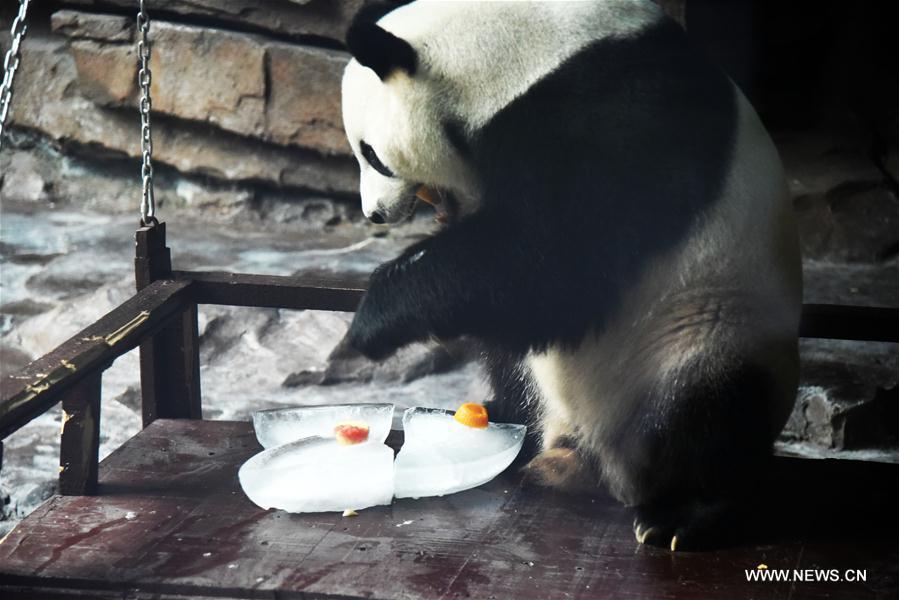 جينان 16 يوليو 2019 (شينخوا) في الصورة الملتقطة 15 يوليو 2019، حيوان الباندا العملاق يأكل الفواكه المجمدة في حديقة الحيوانات البرية بمدينة جينان حاضرة مقاطعة شاندونغ في شرقي الصين، حيث قدمت الحديقة غرفة مجهزة بمكيف الهواء درجة الحرارة فيها 16 درجة مئوية علاوة على فواكه مجمدة وخيزران طازج، لكي يصطاف في الصيف الحار.