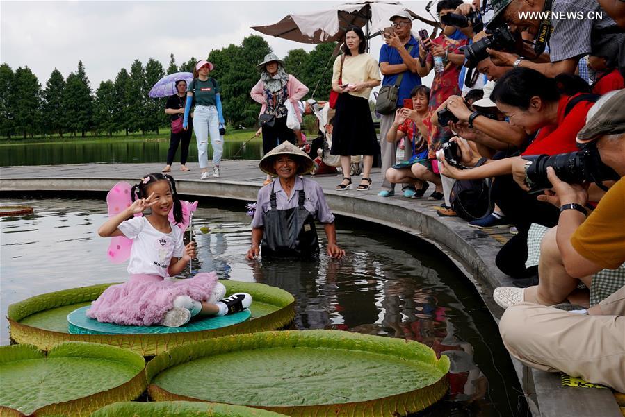 شانغهاي 15 سبتمبر 2019 (شينخوا) في الصورة الملتقطة يوم 14 سبتمبر 2019، الزوار يصورون طفلة تجلس على ورقة زنبق الماء العملاق في حديقة تشنشان للنباتات بمدينة شانغهاي ضمن نشاط علمي بمناسبة اليوم الوطني للعلوم في الصين.