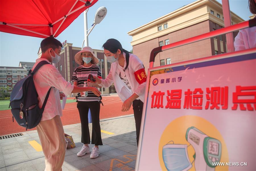 شنيانغ 10 يونيو 2020 (شينخوا) في الصورة الملتقطة يوم 8 يونيو 2020، طالب يخضع لفحص درجة الحرارة في مدرسة تونغهوي الابتدائية في شنيانغ حاضرة مقاطعة لياونينغ بشمال شرقي الصين. وعاد طلبة الصفوف الثالث والرابع والخامس في المدارس الابتدائية في شنيانغ إلى المدارس يوم الاثنين.