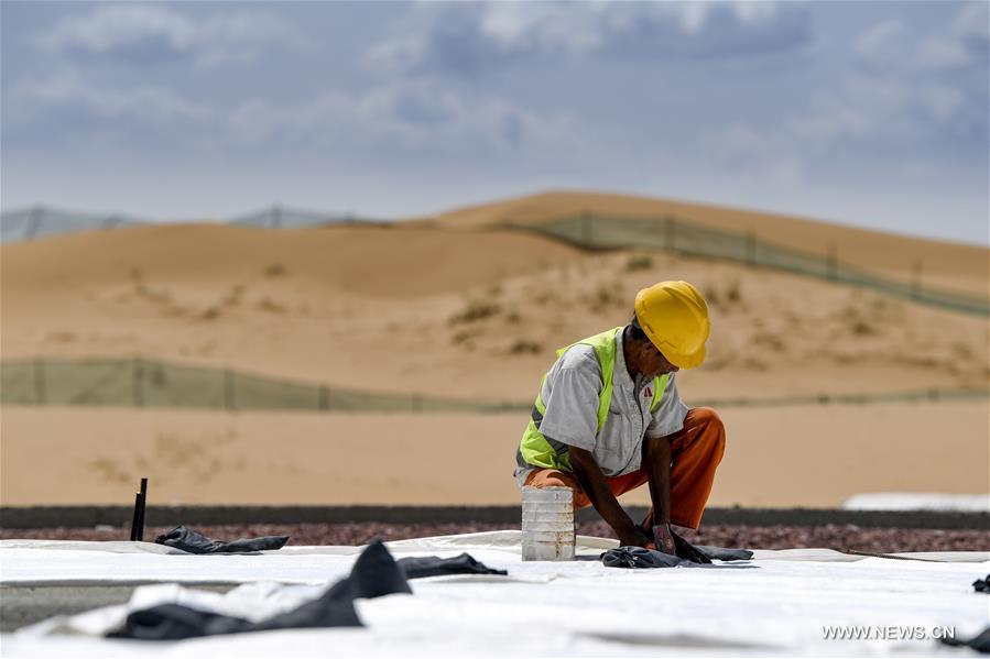 تشونغوي (نينغشيا) 13 يوليو 2020 (شينخوا) في الصورة الملتقطة يوم 10 يوليو 2020، مشهد لبناء أول طريق سريع في الصحراء بمنطقة نينغشيا الذاتية الحكم لقومية هوي بشمال غربي الصين. ويبلغ طول الخط الرئيسي للقسم من الطريق السريع 122.9 كيلومتر، ويعبر 18 كيلومترا منه صحراء تنغر، وهو أول طريق سريع صحراوي يُبنى في نينغشيا. ومن المتوقع أن يتم فتحه أمام حركة المرور في عام 2021.