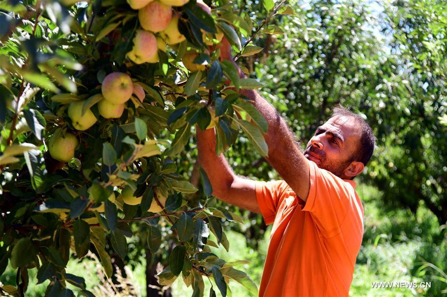 دمشق 24 أغسطس 2020 (شينخوا)، في الصورة الملتقطة يوم 22 أغسطس 2020، فلاح يحصد ثمار التفاح في مدينة الزبداني في ريف دمشق. عاد الفلاحون إلى أراضيهم الزراعية في المدينة التي خربتها الحرب بعد استعادة المدينة. يتمتع الفلاحون هذا العام بأول موسم حصاد منذ عدة أعوام.