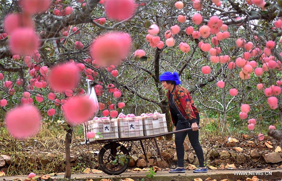 تسيبوه، شاندونغ 17 أكتوبر 2020 (شينخوا) في الصورة الملتقطة يوم 15 أكتوبر 2020، مزارعة تنقل التفاح المقطوف في مزرعة بمحافظة ييوان بمدينة تسيبوه في مقاطعة شاندونغ شرقي الصين. حل موسم القطاف لنحو 20 ألف هكتار من التفاح في محافظة ييوان، حيث اشتغل المزارعون المحليون في قطف وشحن التفاح. ولم يشهد التفاح في ييوان إقبالا في السوق المحلية فحسب، بل بات يُصدر إلى إندونيسيا وتايلاند وغيرهما من الدول.