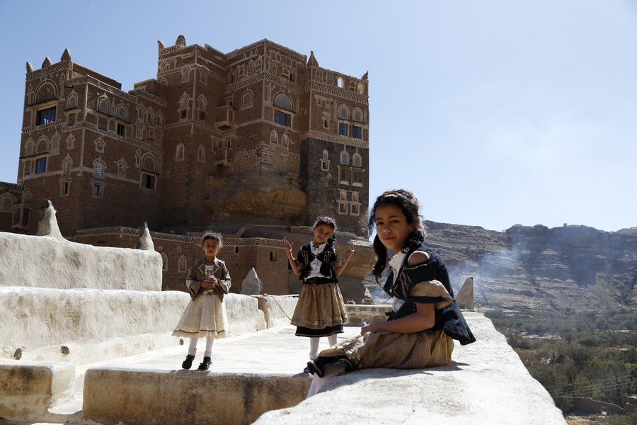 صورة تم التقاطها في أول يناير 2021 تظهر فيها فتيات يرتدين أزياء المهرجانات التقليدية يلعبن في دار الحجر الأثري التاريخي في العاصمة اليمنية صنعاء. (شينخوا)