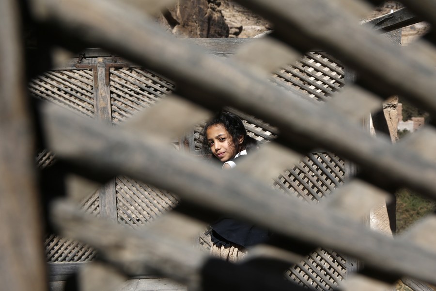 فتاة في دار الحجر الأثري التاريخي في العاصمة اليمنية صنعاء يوم أول يناير 2021. (شينخوا)