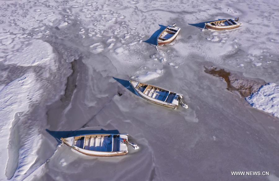 ويهاي 11 يناير 2021 (شينخوا) في الصورة الجوية الملتقطة يوم 8 يناير 2021، قوارب محاصرة في الجليد وسط المياه الضحلة لخليج سانغقو في مدينة رونغتشنغ بمقاطعة شاندونغ شرقي الصين. وتجمد جزء من المياه الضحلة للخليج بسبب درجة الحرارة المنخفضة التي وصلت إلى 14 درجة مئوية تحت الصفر.