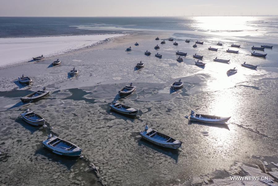 قوارب محاصرة وسط الجليد في مقاطعة شاندونغ شرقي الصين بسبب درجة الحرارة المنخفضة