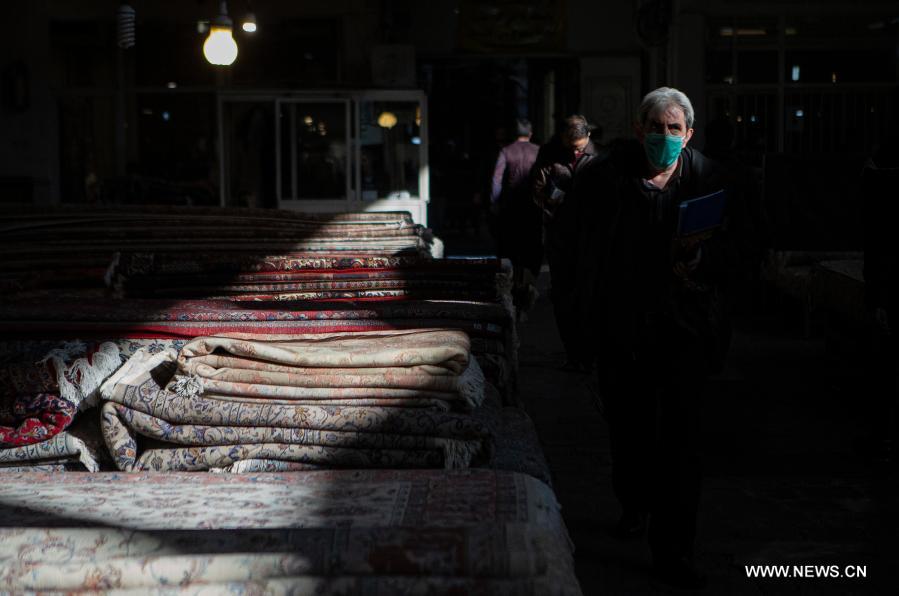 طهران أول مارس 2021 (شينخوا) في الصورة الملتقطة يوم 27 فبراير 2021، أشخاص يسيرون إلى جانب السجاد المنسوج يدويا في سوق قديمة للسجاد وسط مدينة طهران في إيران.