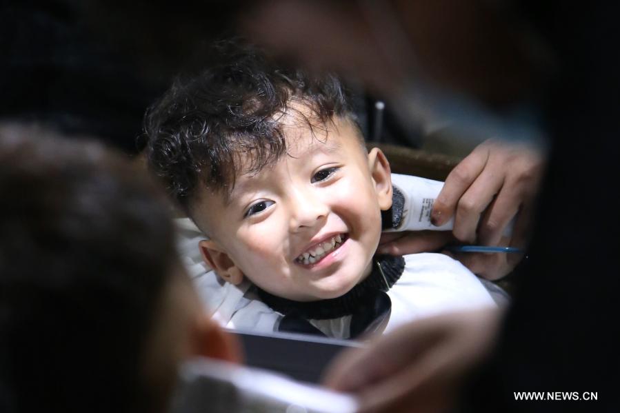 شييان 15 مارس 2021 (شينخوا) في الصورة الملتقطة يوم 14 مارس 2021، حلاق يقص شعر طفل في مدينة شييان بمقاطعة هوبي وسط الصين.