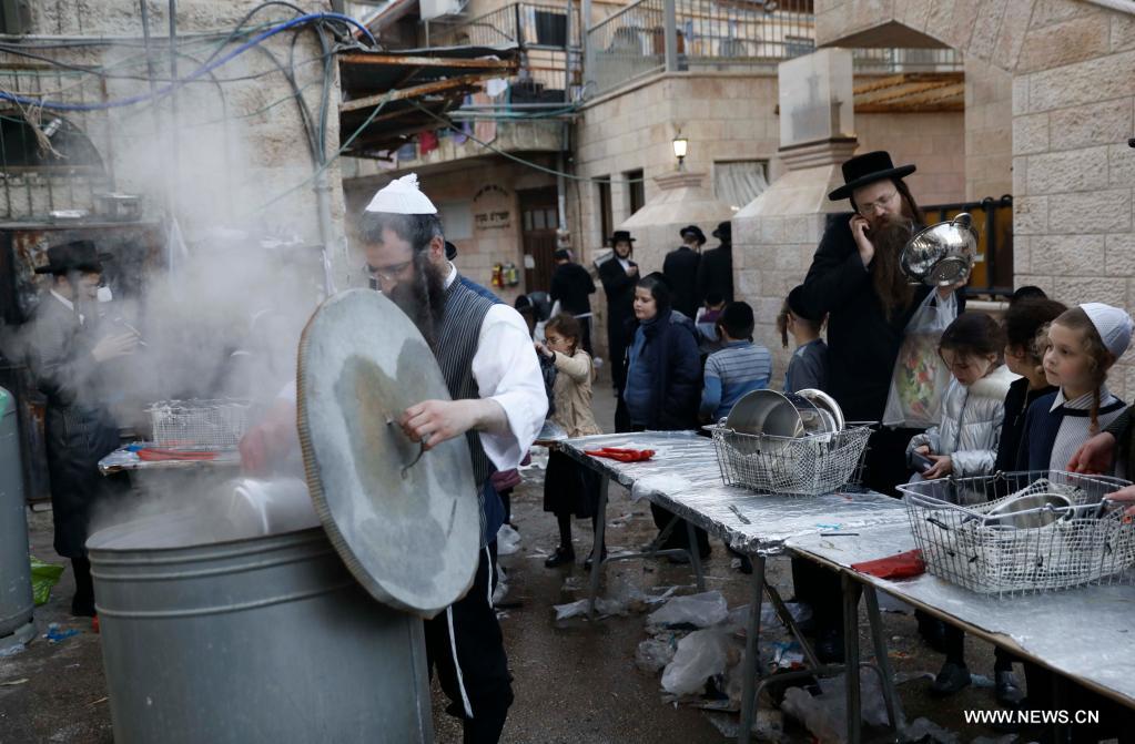 القدس 26 مارس 2021 (شينخوا) في الصورة الملتقطة يوم 24 مارس 2021، اليهود الأرثوذكس المتشددون يغمسون أواني الطهي في الماء المغلي لإزالة بقايا الخميرة خلال التجهيزات الأخيرة قبل بداية عطلة عيد الفصح اليهودي في القدس.