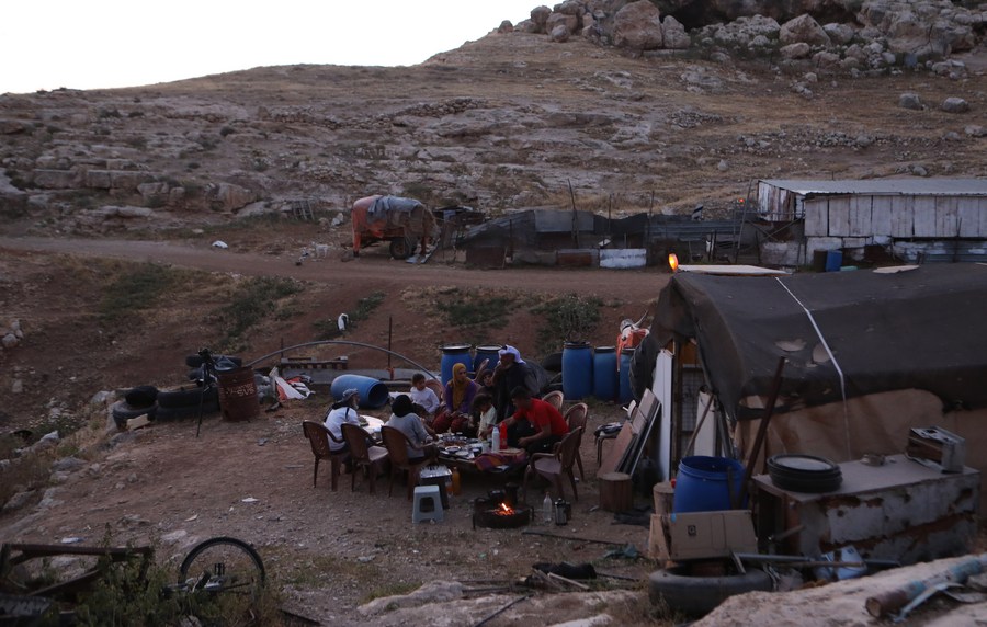 أفراد عائلة فلسطينية يتناولون الإفطار خلال شهر رمضان المبارك في قرية السموع جنوبي مدينة الخليل بالضفة الغربية، في 21 أبريل 2021 .(شينخوا)