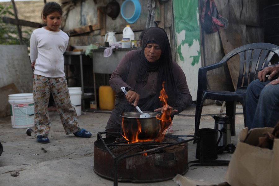 امرأة فلسطينية تجهز وجبة الإفطار بينما تنظر إليها طفلة خلال شهر رمضان المبارك في قرية السموع جنوبي مدينة الخليل بالضفة الغربية، في 21 أبريل 2021 .(شينخوا)
