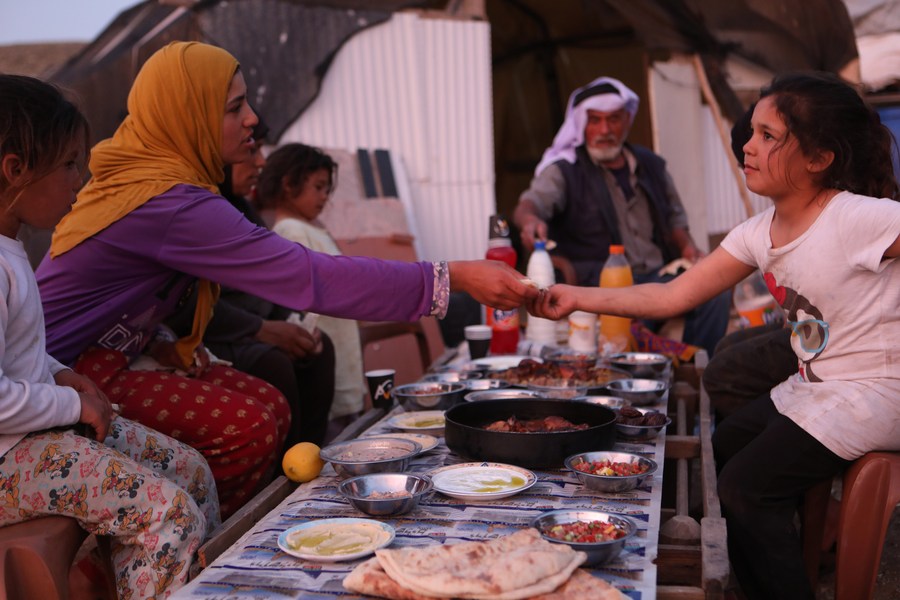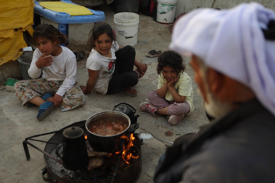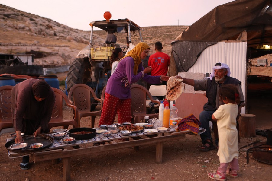 أطفال ينتظرون تناول الإفطار خلال شهر رمضان المبارك في قرية السموع جنوبي مدينة الخليل بالضفة الغربية، في 21 أبريل 2021 .(شينخوا)■