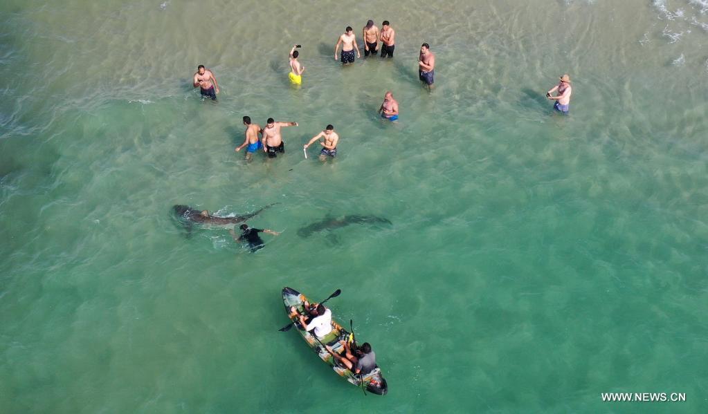 الخضيرة، إسرائيل 22 أبريل 2021 (شينخوا) في الصورة الملتقطة من الجو يوم 20 أبريل 2021، إسرائيليون يسبحون بالقرب من أسماك القرش في البحر الأبيض المتوسط قبالة ساحل مدينة الخضيرة شمالي إسرائيل.