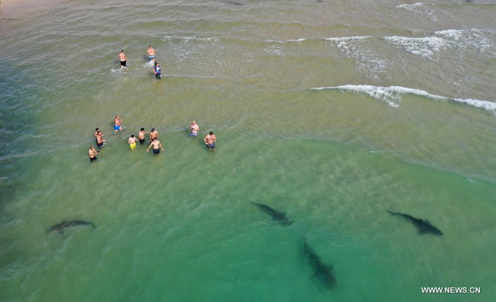 الخضيرة، إسرائيل 22 أبريل 2021 (شينخوا) في الصورة الملتقطة من الجو يوم 20 أبريل 2021، إسرائيليون يسبحون بالقرب من أسماك القرش في البحر الأبيض المتوسط قبالة ساحل مدينة الخضيرة شمالي إسرائيل.