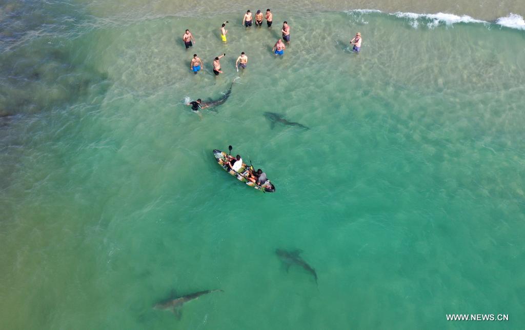 الخضيرة، إسرائيل 22 أبريل 2021 (شينخوا) في الصورة الملتقطة من الجو يوم 20 أبريل 2021، إسرائيليون يسبحون بالقرب من أسماك القرش في البحر الأبيض المتوسط قبالة ساحل مدينة الخضيرة شمالي إسرائيل.