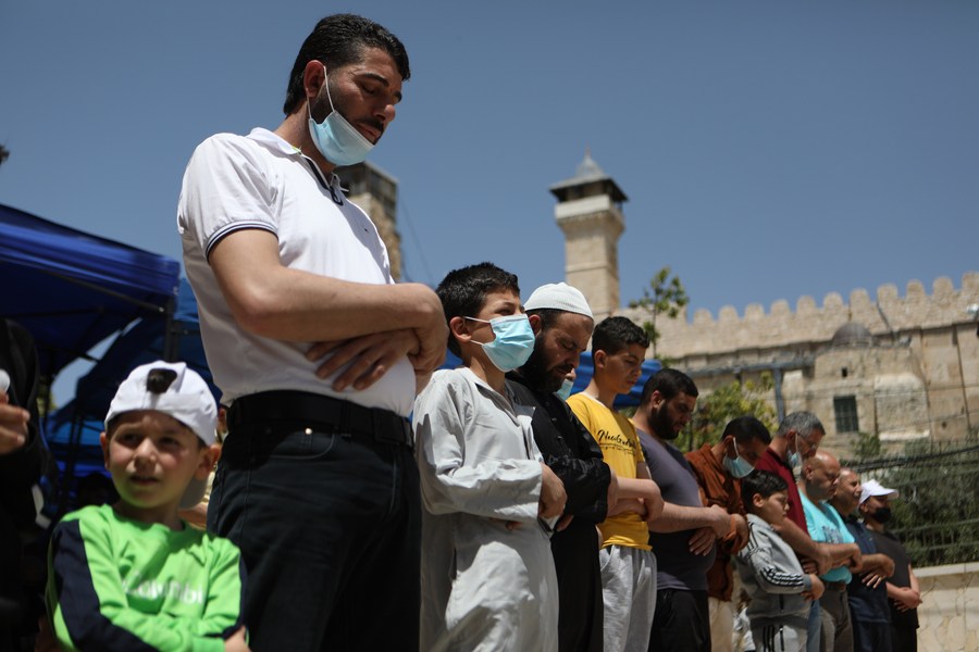 أناس يصلون خارج الحرم الإبراهيمي خلال صلاة الجمعة الثانية من شهر رمضان المبارك في مدينة الخليل بالضفة الغربية يوم 23 أبريل 2021. (شينخوا)