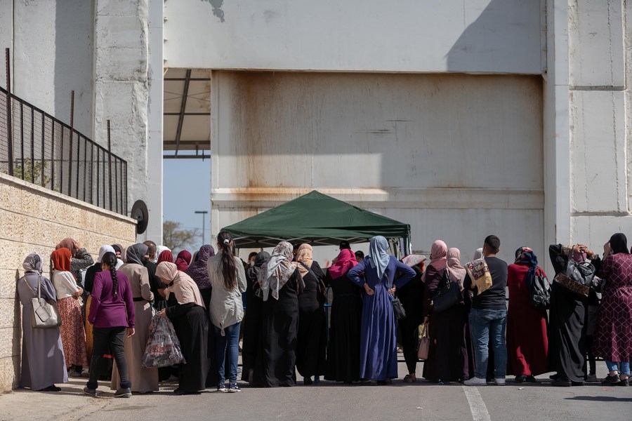 صورة التقطت يوم 23 أبريل 2021 تظهر فلسطينيين واقفين عند نقطة تفتيش إسرائيلية وهم في طريقهم لحضور صلاة الجمعة الثانية من شهر رمضان المبارك في المسجد الأقصى بالقدس في مدينة بيت لحم بالضفة الغربية يوم 23 أبريل 2021. (شينخوا)