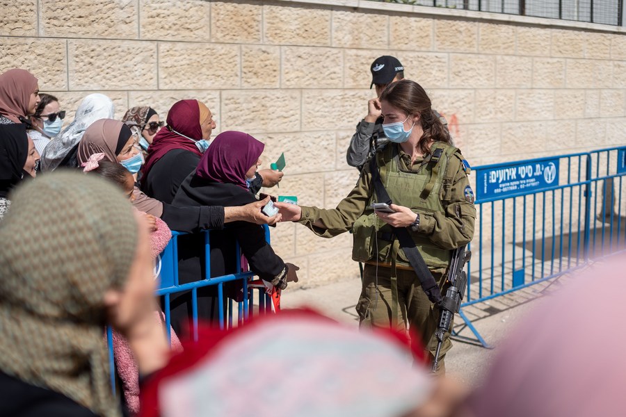 جندية إسرائيلية تتحقق من بطاقة هوية امرأة فلسطينية تمر عبر نقطة تفتيش إسرائيلية لحضور صلاة الجمعة الثانية من شهر رمضان المبارك في المسجد الأقصى بالقدس في مدينة بيت لحم بالضفة الغربية يوم 23 أبريل 2021. (شينخوا)■