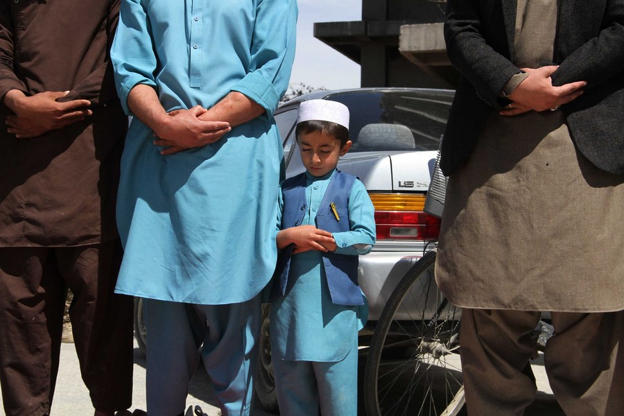 مسلمون يؤدون صلاة الجمعة الأولى خلال شهر رمضان المبارك في غزني شرقي أفغانستان يوم 16 أبريل 2021. (شينخوا)